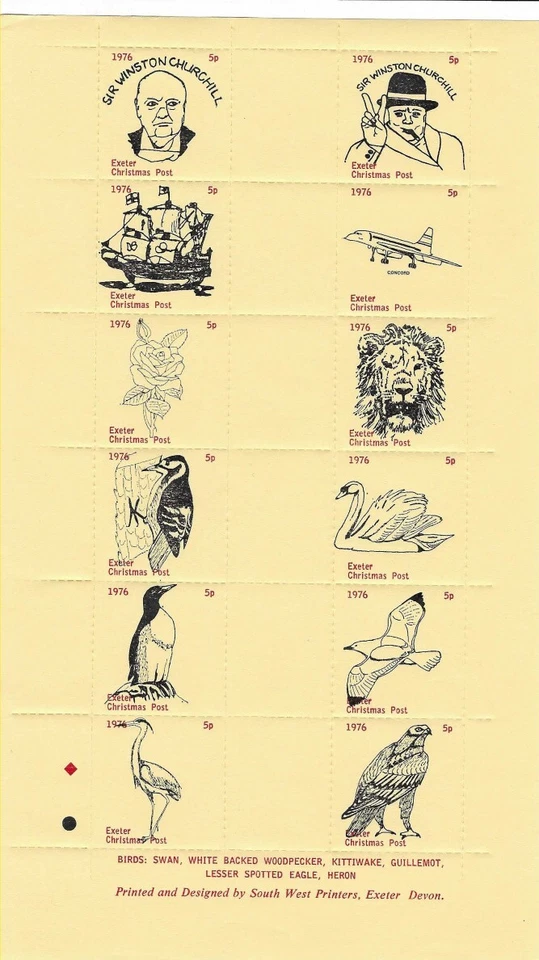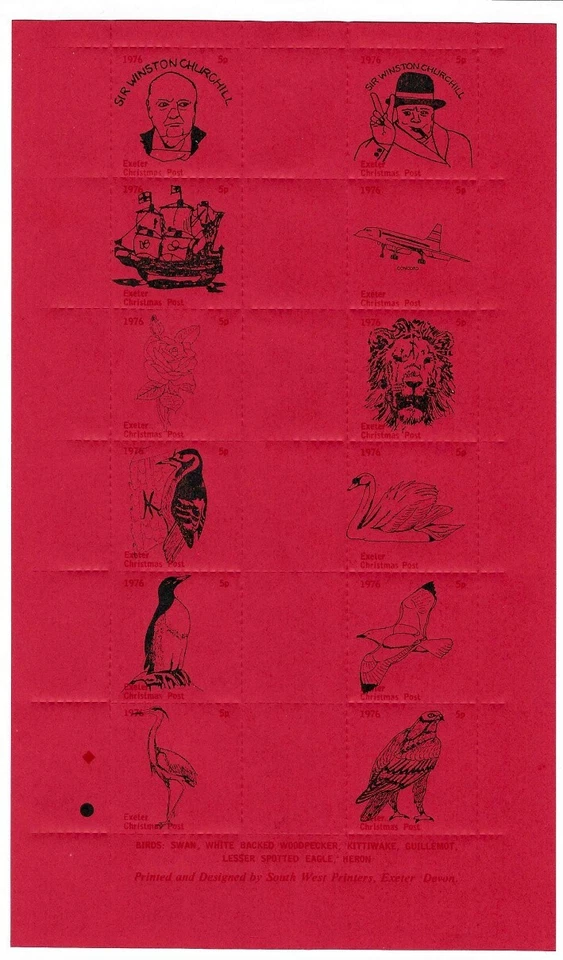 GB 1976 Exeter Christmas Post Sheet, Red, Winston Churchill Birds etc UNM/MNH