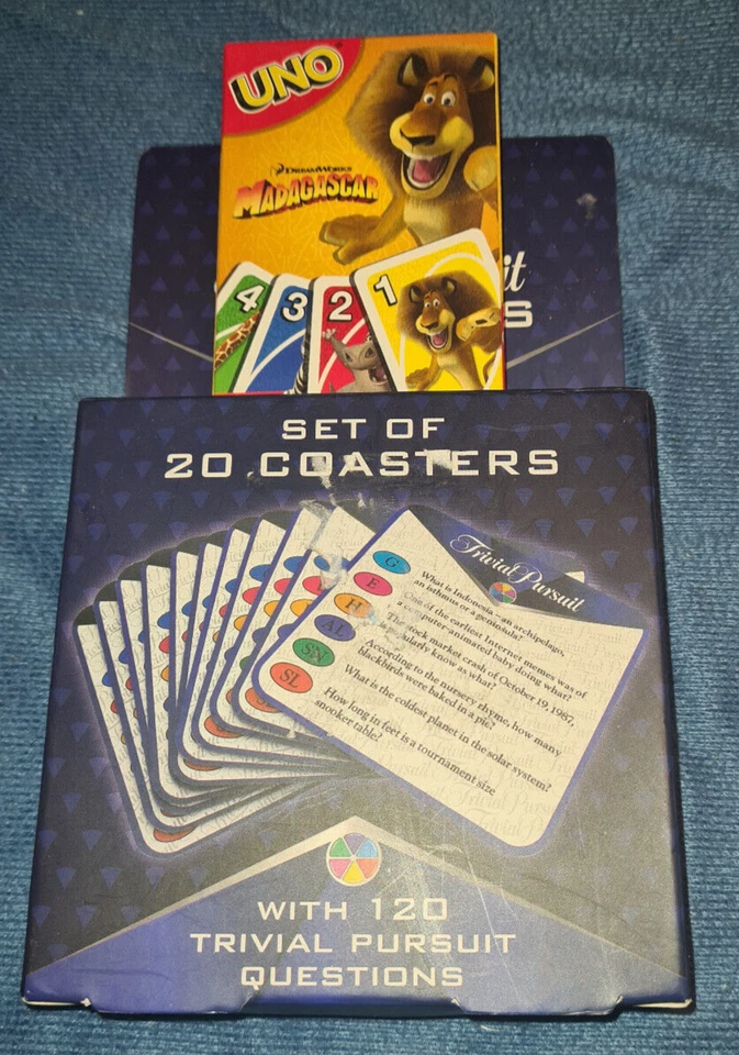 Trivial Pursuit coasters new, sealed, plus pack of Madagascar Uno cards thrown