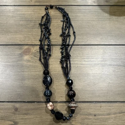 Vintage Boheniman Black Gray Glass Seed Bead Multi Strand Necklace 20”