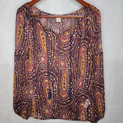 Lucky Brand Blouse Sheer Red Blue Paisley Long Sleeve Tassel V-neck Boho Peasant