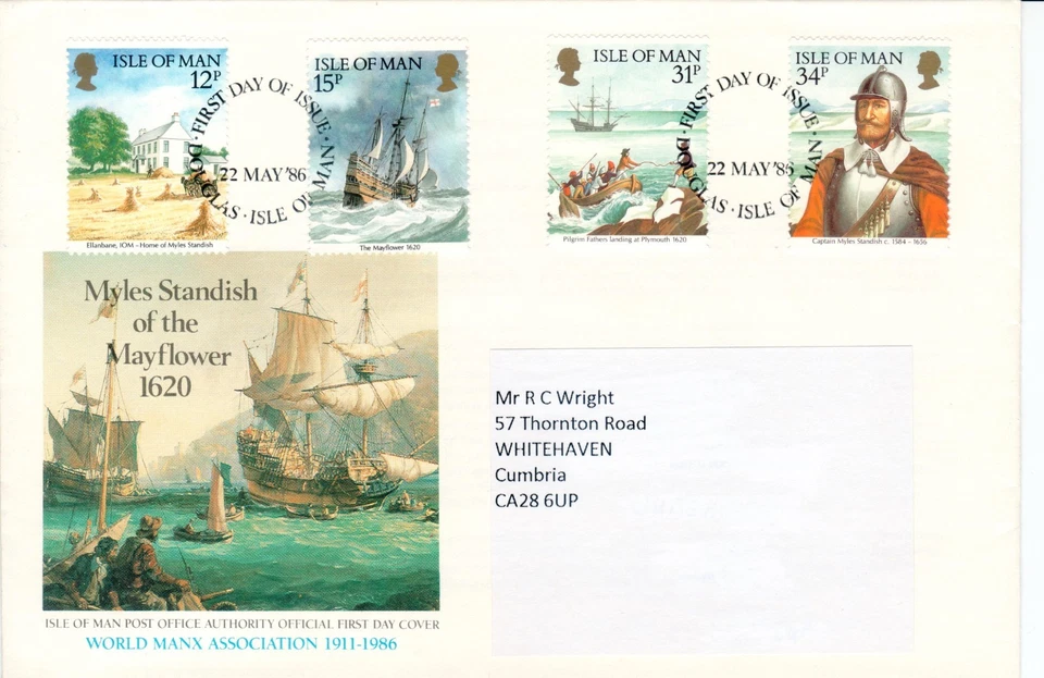 IOM FDC 1986 Captain Miles Standish of the Mayflower SG 321-324