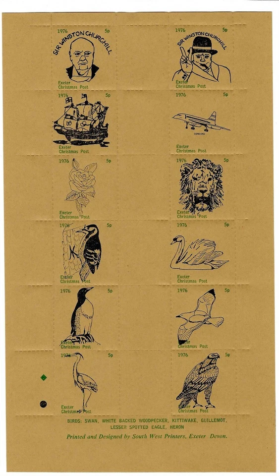 GB 1976 Exeter Christmas Post Sheet, Brown, Winston Churchill Birds etc UNM/MNH
