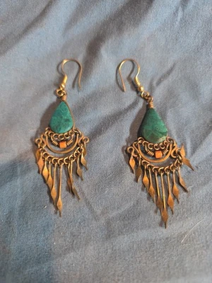 Dark Green Turquoise Tear Drop Metalwork Spike Earrings