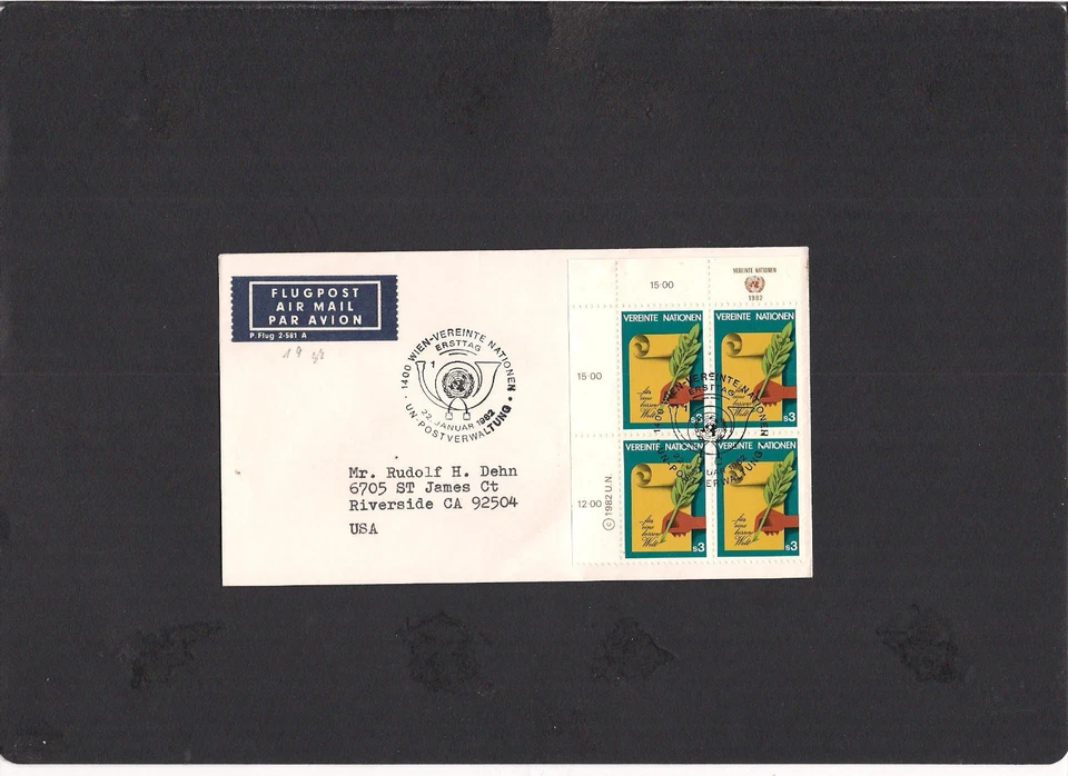 Airmail Cover UN Vienna to St. James (USA) "First Day 22/01/82" with Block of 4