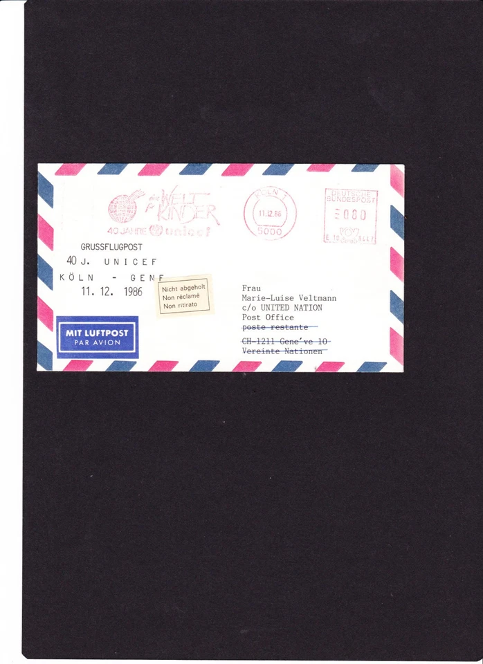 Greeting airmail "40 years UNICEF Cologne-Geneva 11.12.1986" slodge stamp. rare!!!
