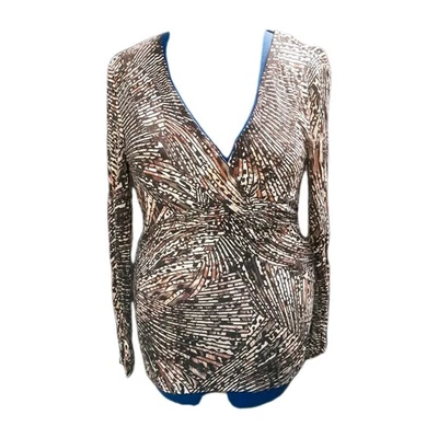 Women's Medium Brown Multicolor Long Slewvw Abstract V Neck Fashion Top