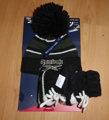 Baby's Reebok Hat & Booties Set 0-6 Months, Recycled Yarn, Black/Green/White