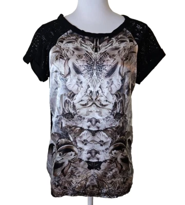 ONE WORLD Lion Rib Silky print lace top shirt blouse M Medium