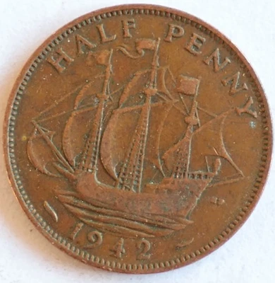 1942 UK Half Penny Coin – King George VI – Bronze Ship