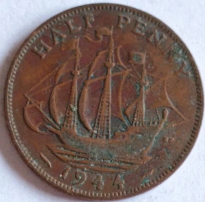 1944 UK Half Penny Coin – King George VI – Bronze Ship
