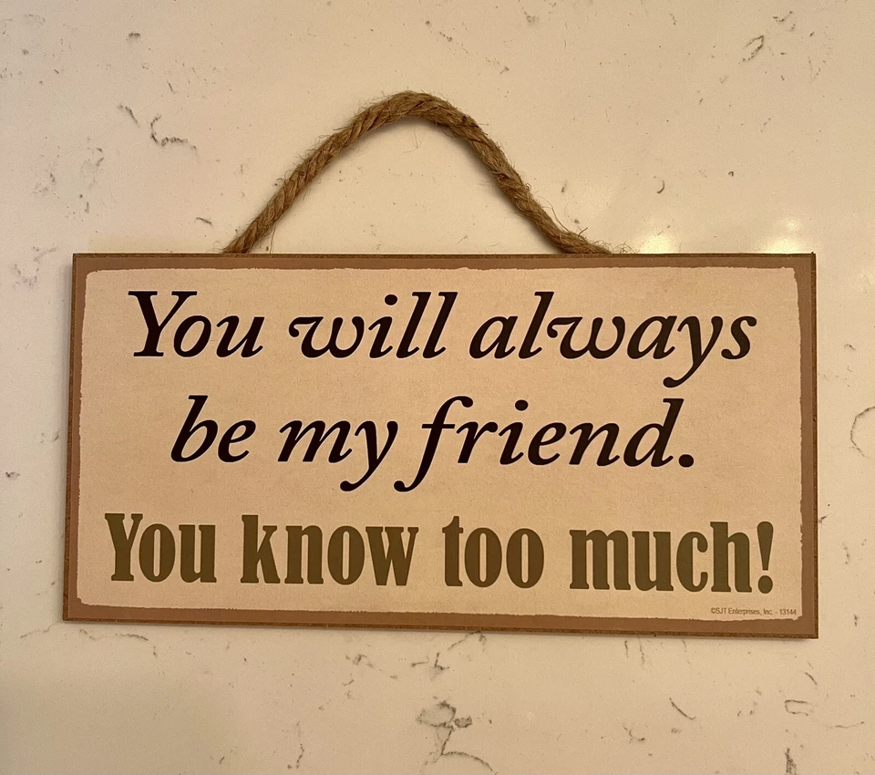 “You Will Always Be My Friend. You Know Too Much!” love laughter wooden signs