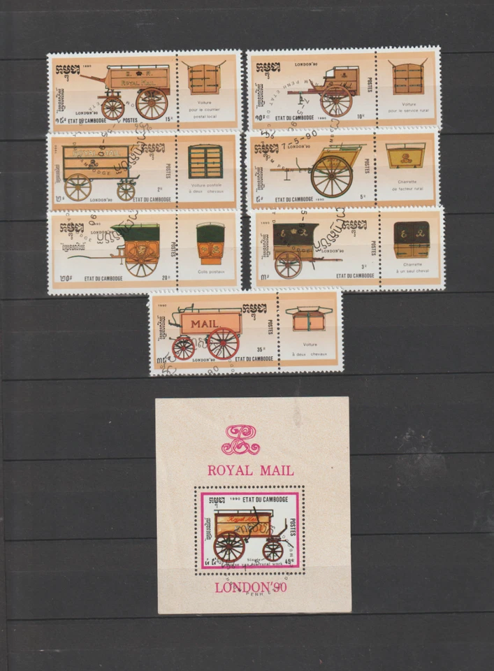 Complete Set + Block-Hist.-Asian Carriages-Cambodia 1990-Stamped-EXCELLENT