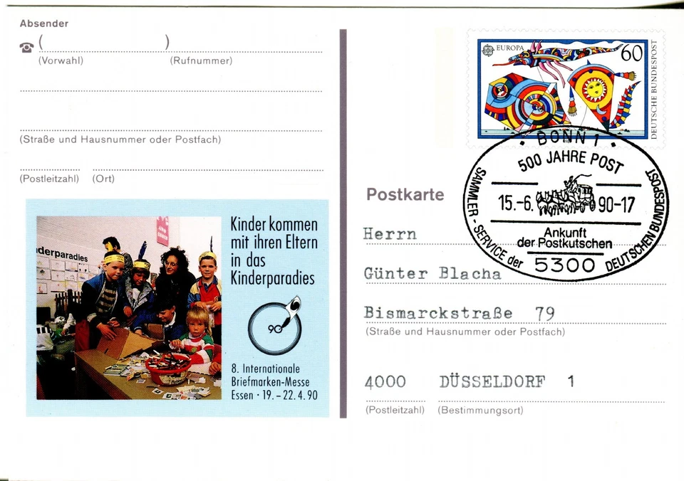 1990 Germany. Bonn 1 postmark on Europa 60pf postal Stationary Postcard