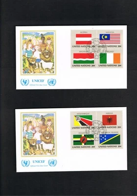 4 UNO FDC's - Mi. No. 397-412 "Flags" Block of 4 Centerpiece on UNICEF Cover!