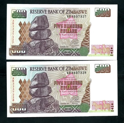 Zimbabwe (P11a) 500 Dollars 2001 x 2 Consecutive UNC