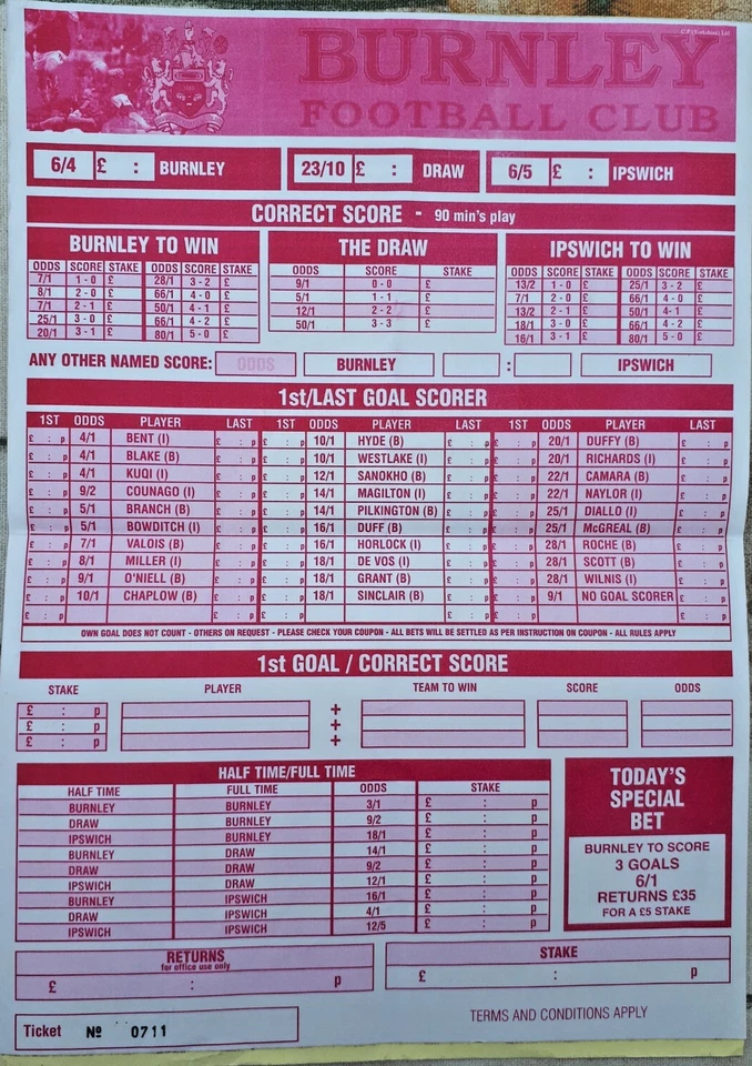 Burnley v Ipswich Town official betting sheet 2004/05 season