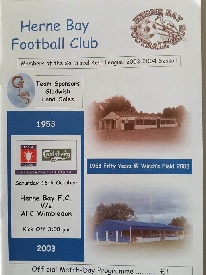 Herne Bay V AFC Wimbledon Fa Vase 1st Round Programme Played 18th October 2003